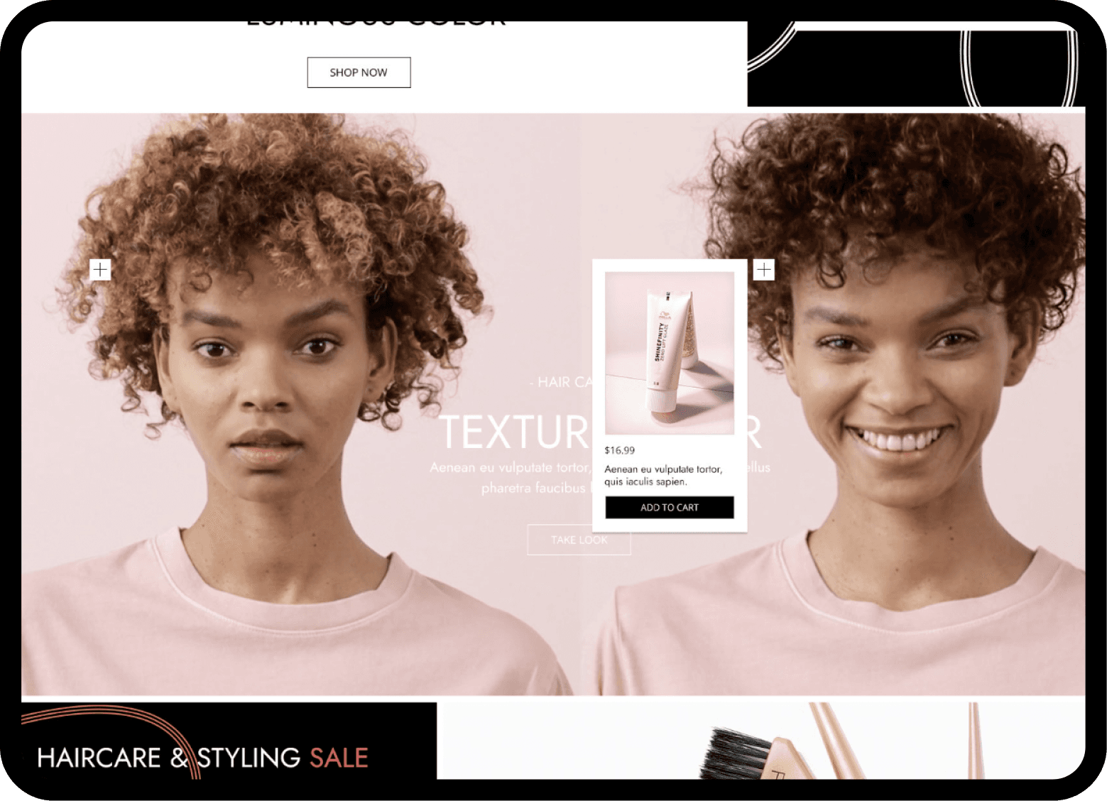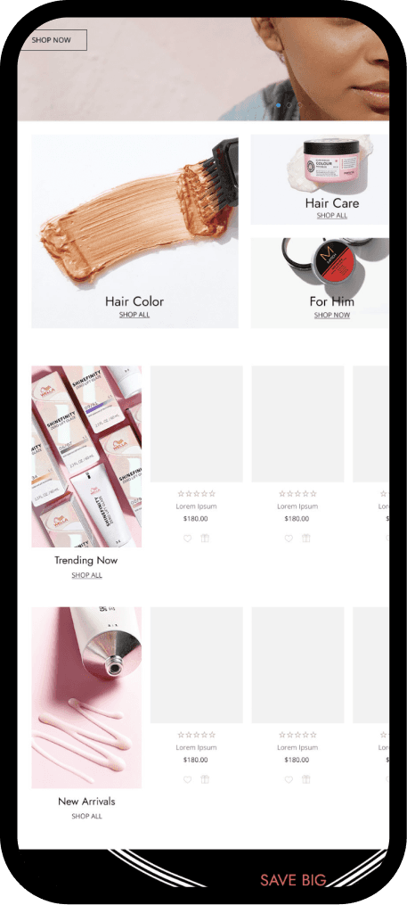 Digital experience for a B2B salon retailer. Elevated photography, simplified navigation, and shoppable components built for working stylists.