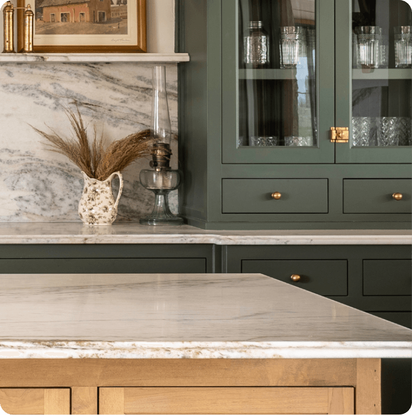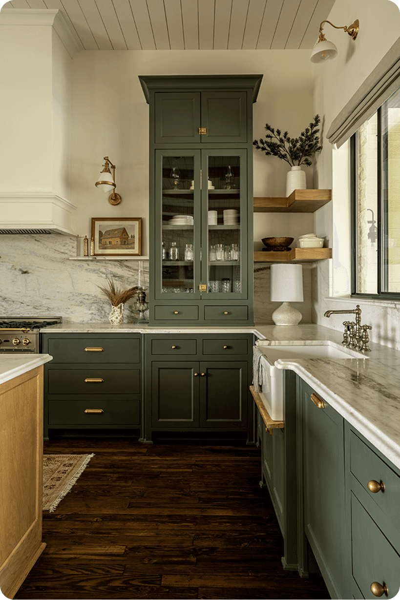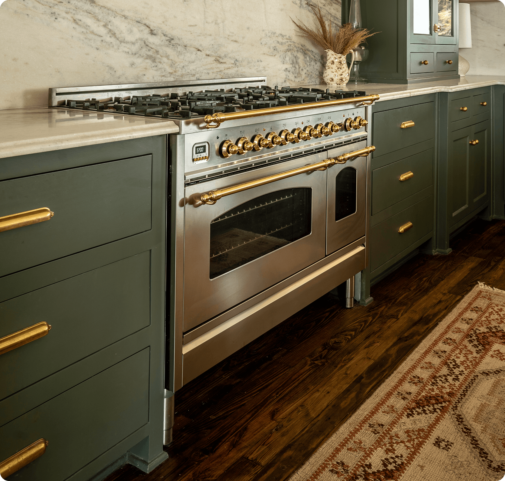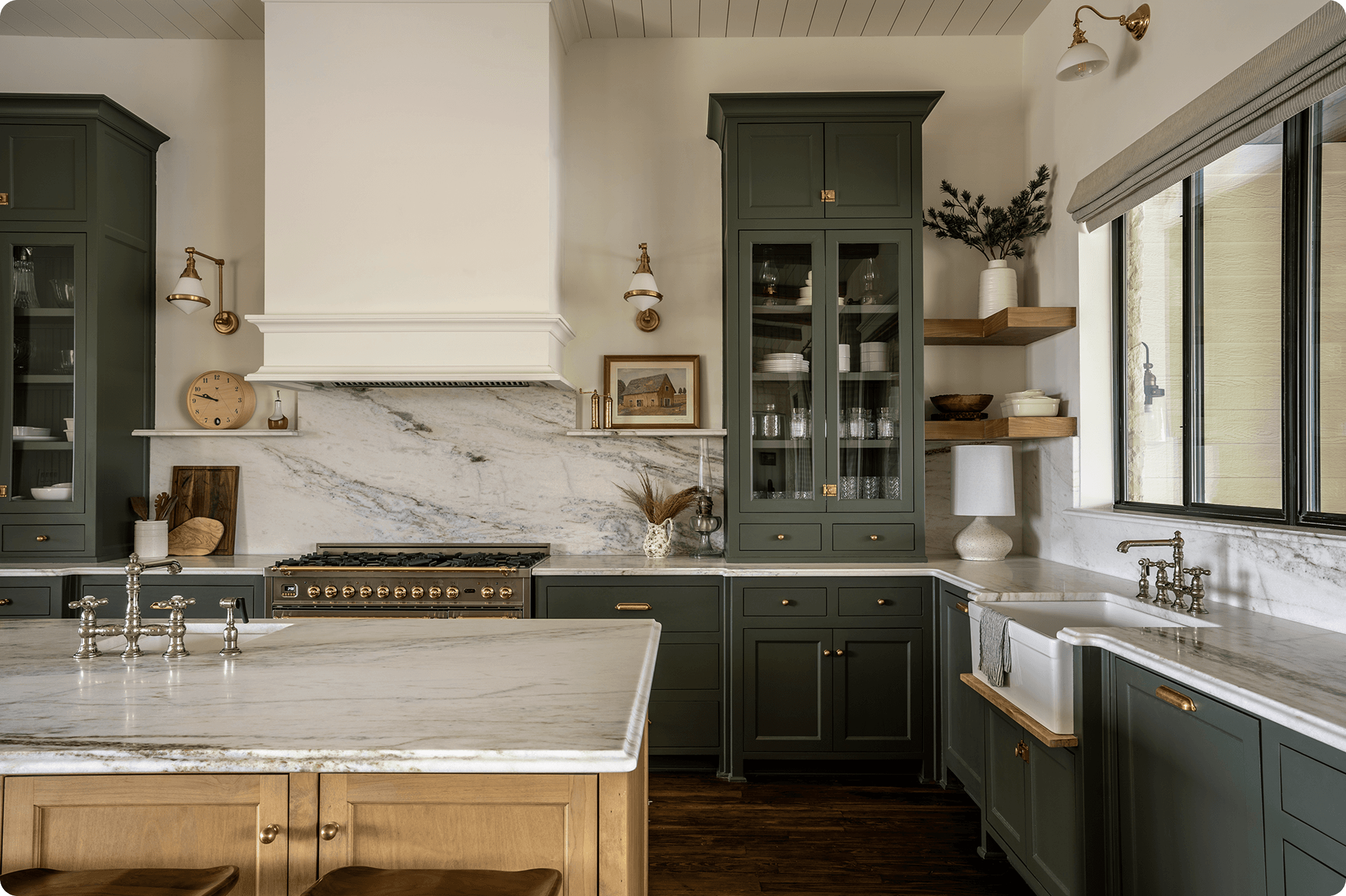 Cabinetry in a custom green, chosen to hold its own against the warmth of the floors and the weight of the marble. Counters and full-height backsplash in veined marble. Island built from stained maple with open shelving below. Ilve range as the centerpiece. High-end finishes, but nothing precious. A kitchen meant to be used.