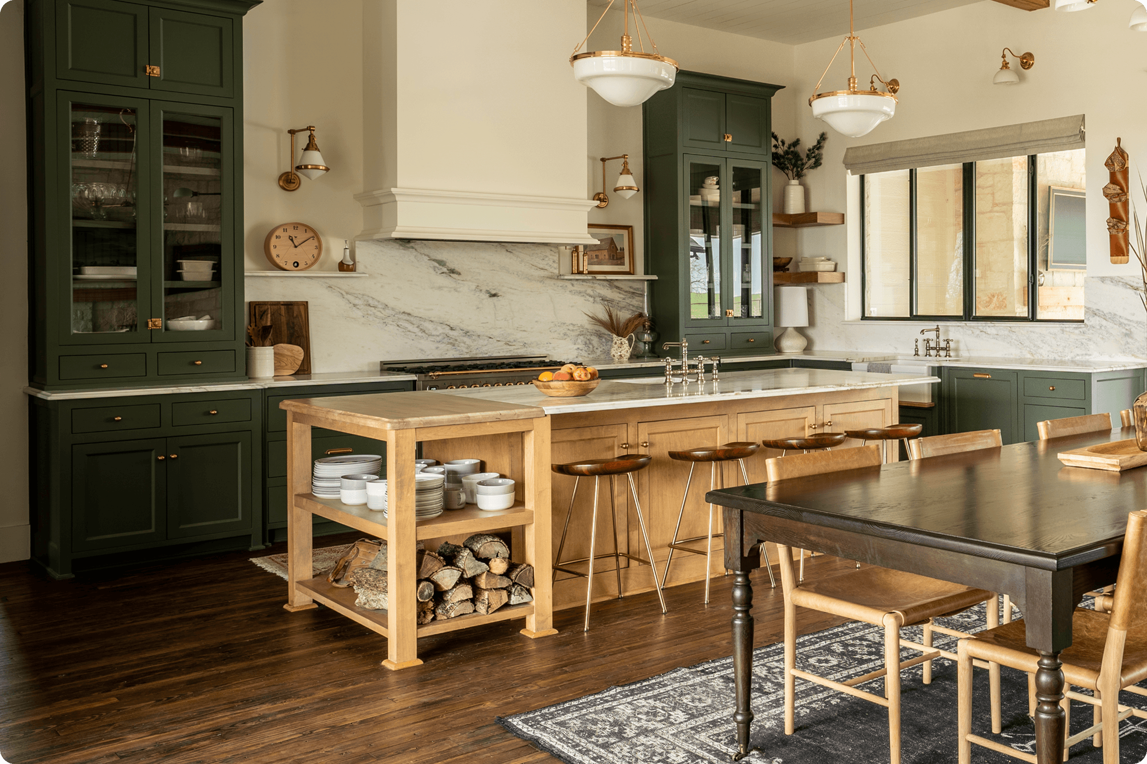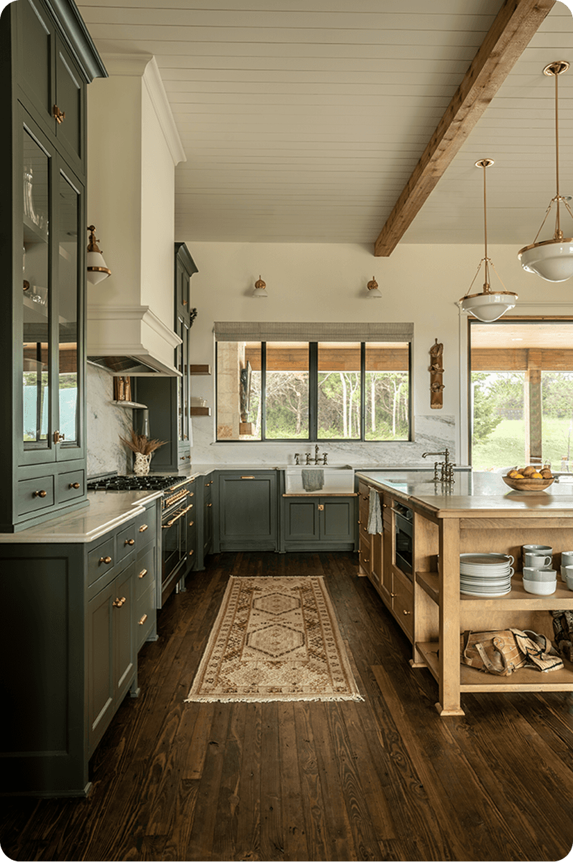 Custom kitchen anchoring a 4,500 sq ft Texas home. Reclaimed pine, marble surfaces, and brass hardware balancing high-end appliances with heirloom warmth.