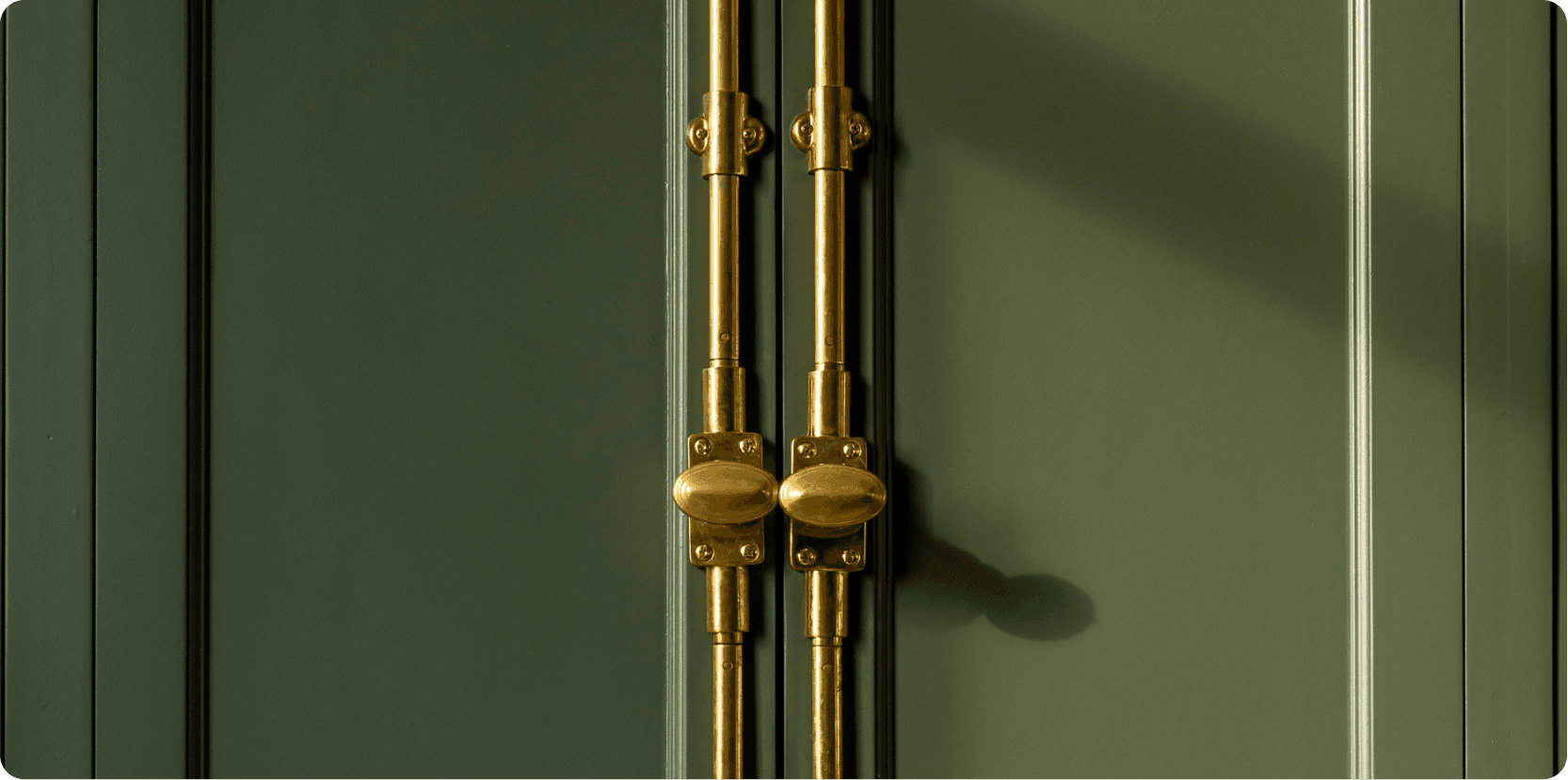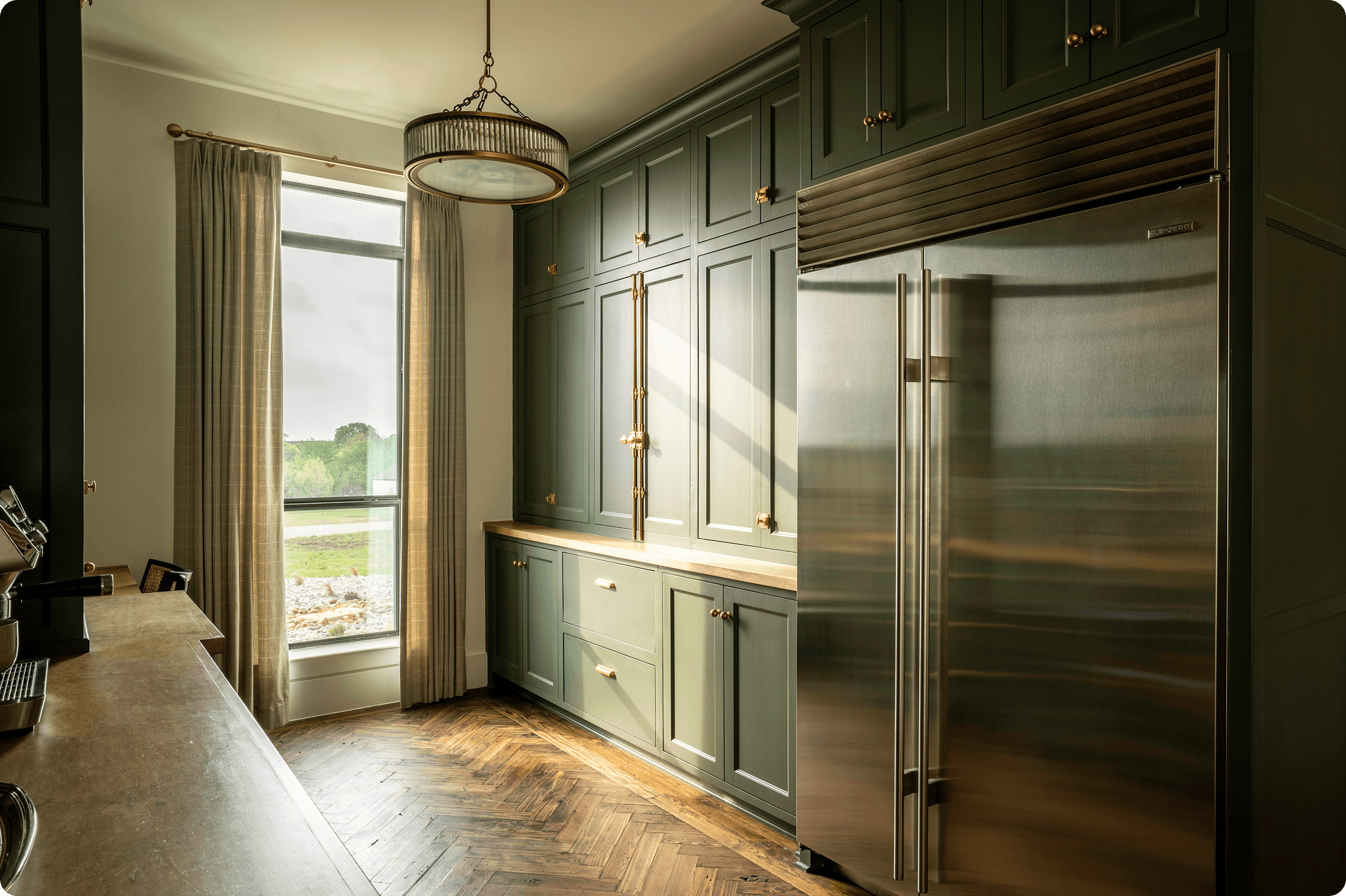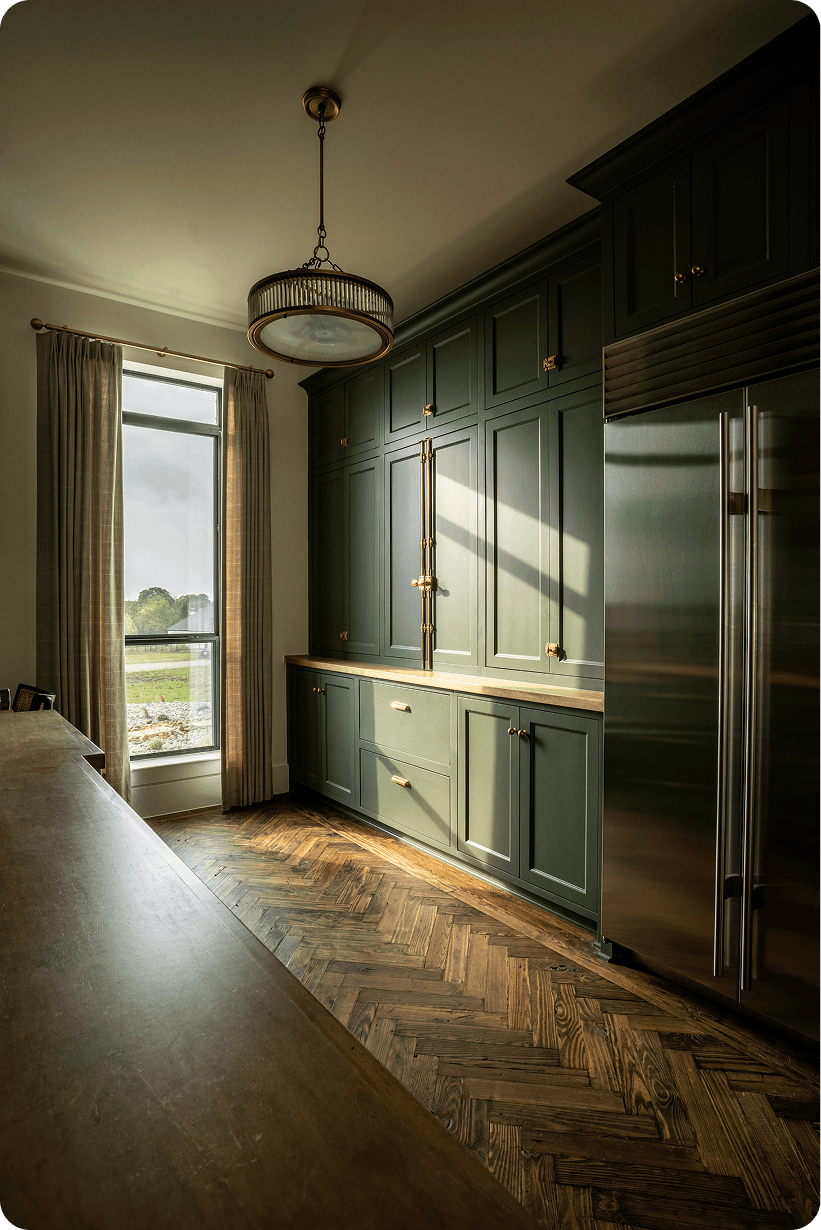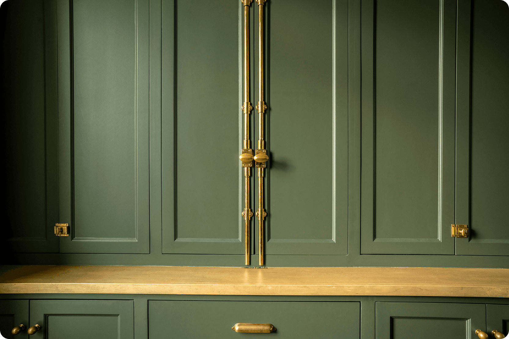The floors are reclaimed 1950s pine carried through from the main living areas. Herringbone pattern in the pantry to distinguish the space. Brass cremone bolts on the pantry doors break up the cabinet wall and add hardware with presence. Behind them, the pantry is fully built out with custom cabinetry, pullouts, and organizers. Function hidden behind furniture-grade detail.
