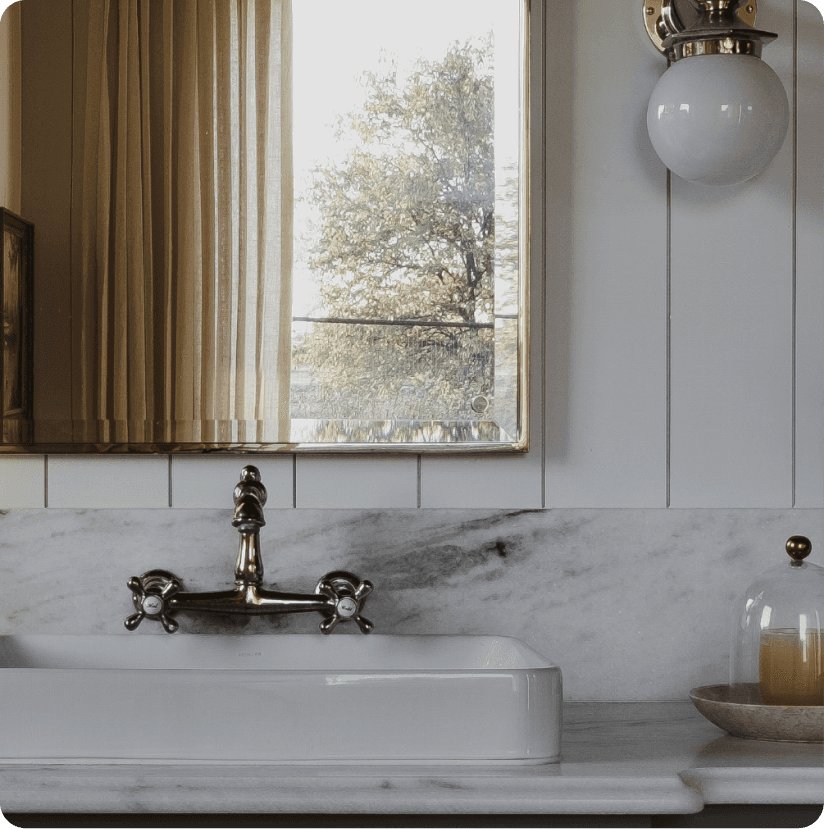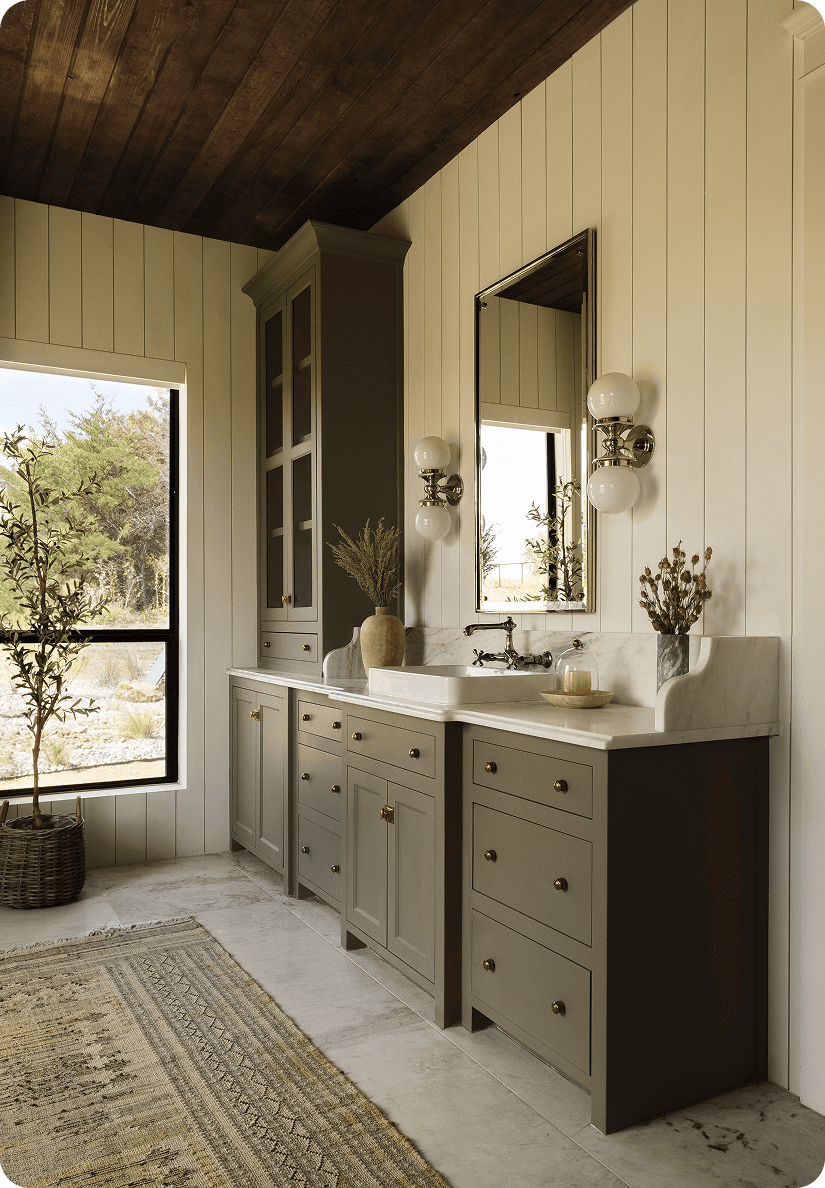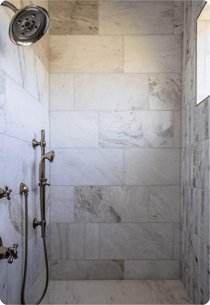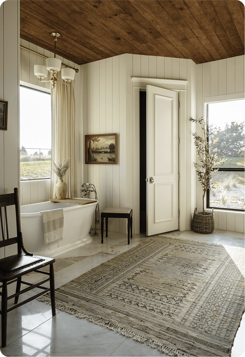 Marble surfaces, warm metal fixtures, and wood ceilings. A 400 square foot bathroom designed to feel collected rather than spec'd.