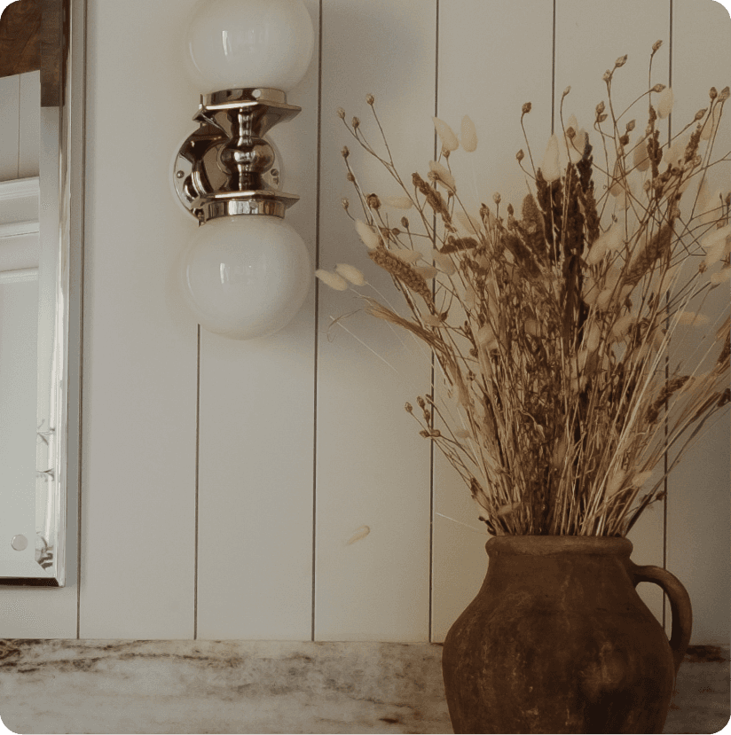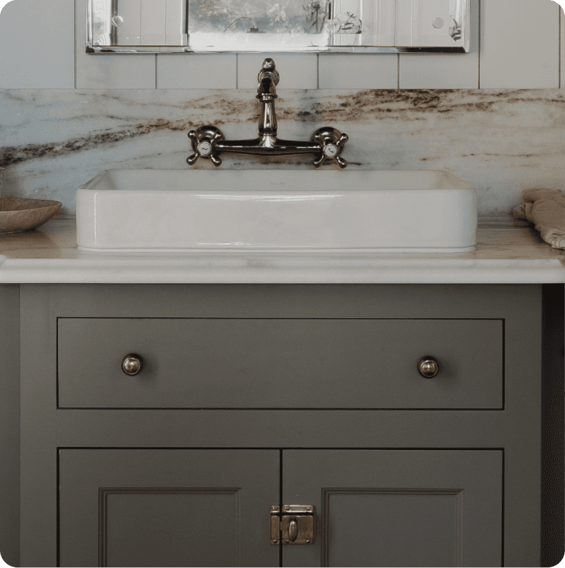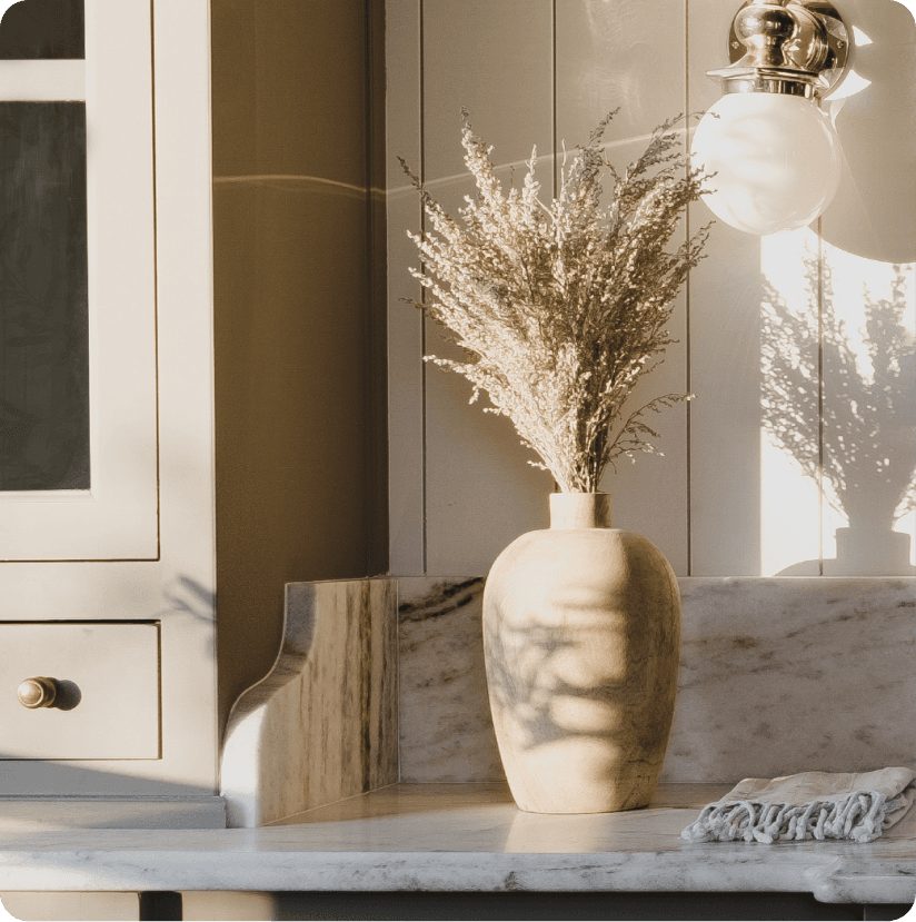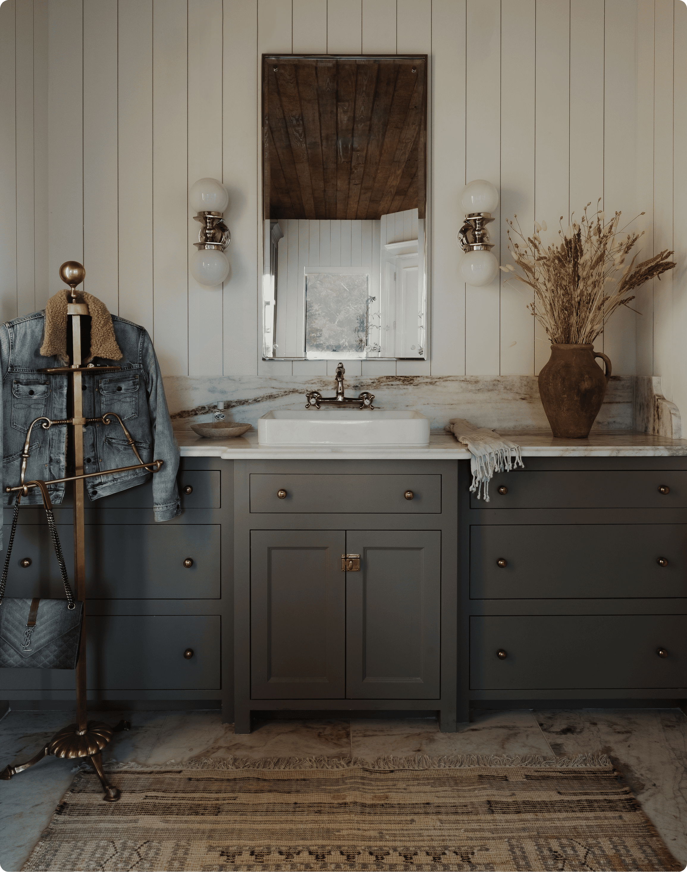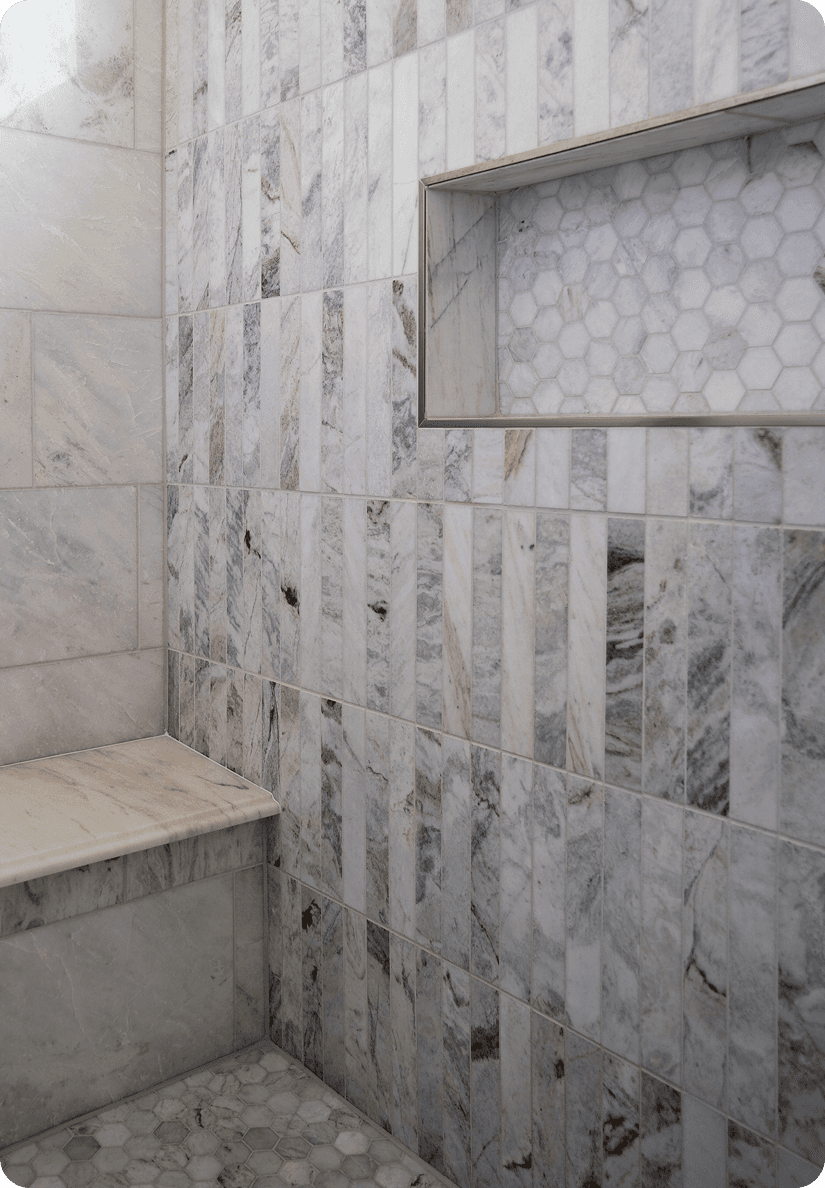 Marble surfaces, warm metal fixtures, and wood ceilings. A 400 square foot bathroom designed to feel collected rather than spec'd.